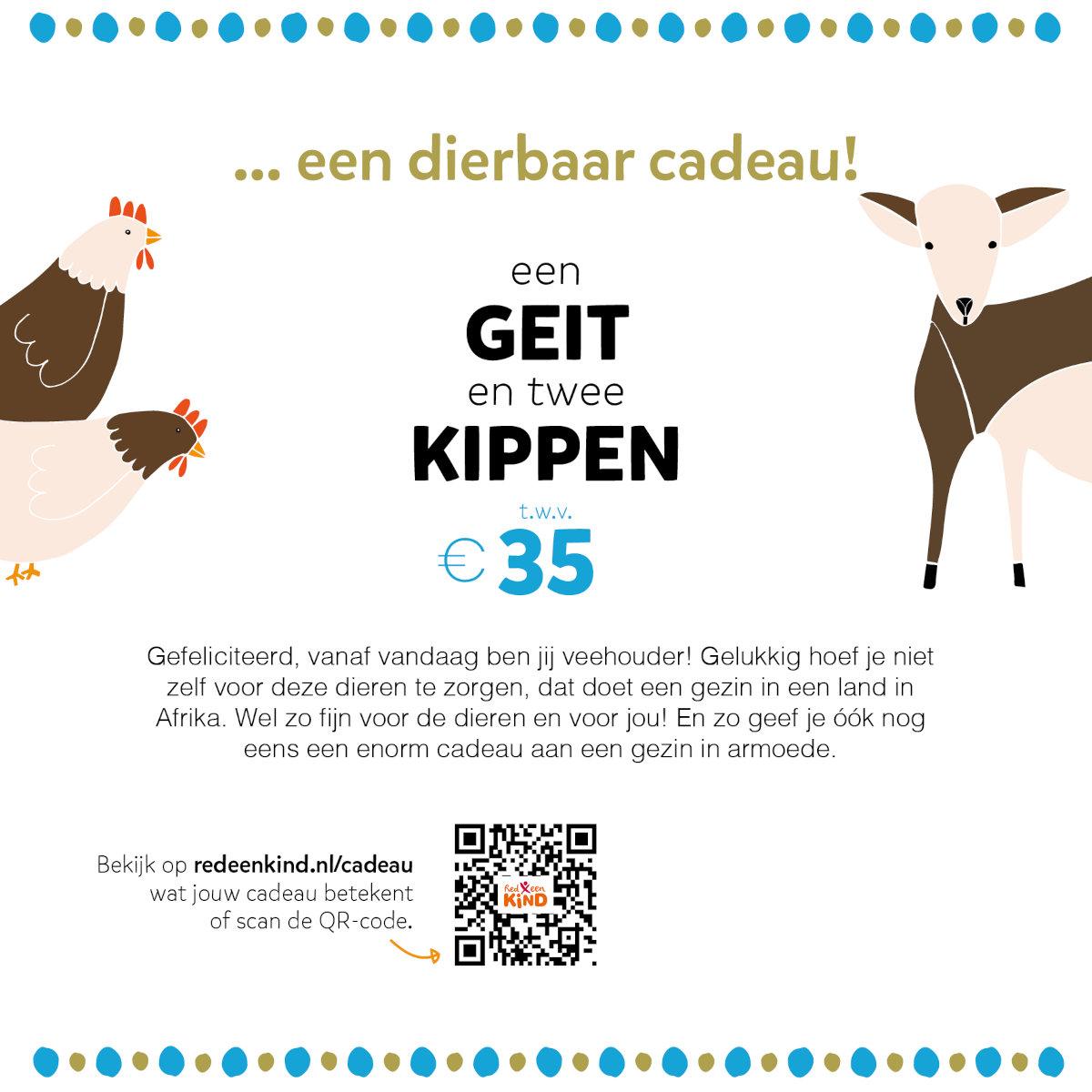 Geef symbolisch een geit en 2 kippen cadeau en steun een gezin in armoede! Met 1 geit heeft een gezin dagelijks verse melk en mest voor vruchtbare grond. Met 2 kippen heeft een gezin dagelijks eieren, kuikens voor andere gezinnen en na verloop van tijd goede handelswaar voor op de markt. De cadeaukaart met jouw persoonlijke boodschap wordt per e-mail gratis verstuurd of bezorgd op een door jouw gekozen adres in Nederland.